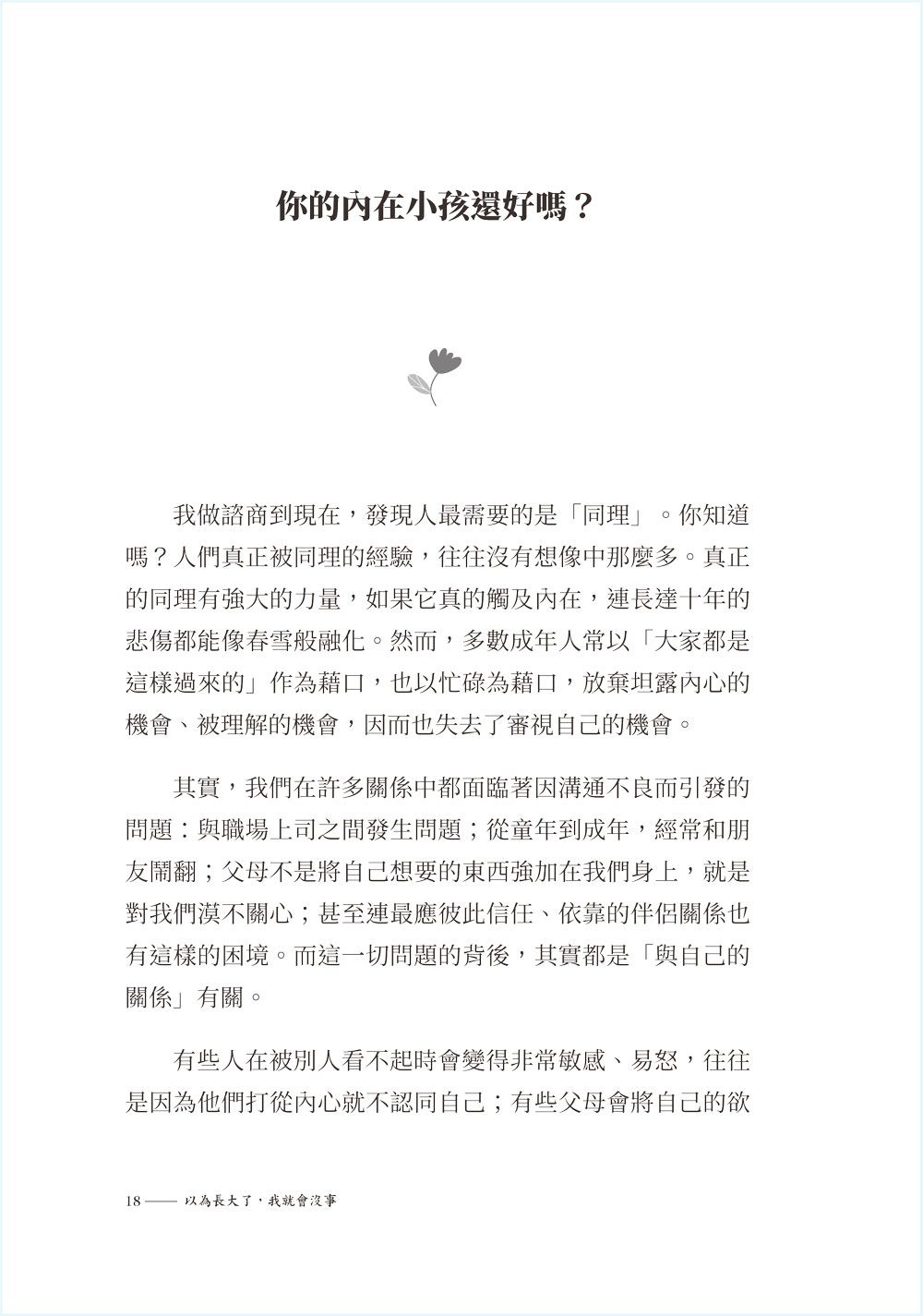 我做諮商到現在,發現人最需要的是「同理」。你知道嗎?人們真正被同理的經驗,往往沒有想像中那麼多。真正的同理有強大的力量,如果它真的觸及內在,連長達十年的悲傷都能像春雪般融化。然而,多數成年人常以「大家都是這樣過來的」作為藉口,也以忙碌為藉口,放棄坦露內心的機會、被理解的機會,因而也失去了審視自己的機會。