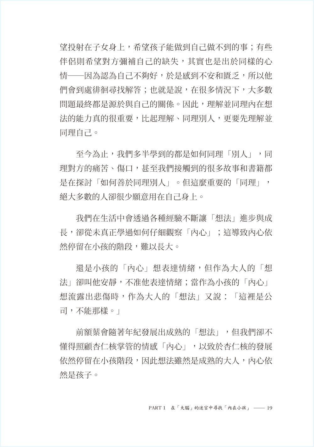 前額葉會隨著年紀發展出成熟的「想法」,但我們卻不懂得照顧杏仁核掌管的情感「內心」,以致於杏仁核的發展依然停留在小孩階段,因此想法雖然是成熟的大人,內心依然是孩子。