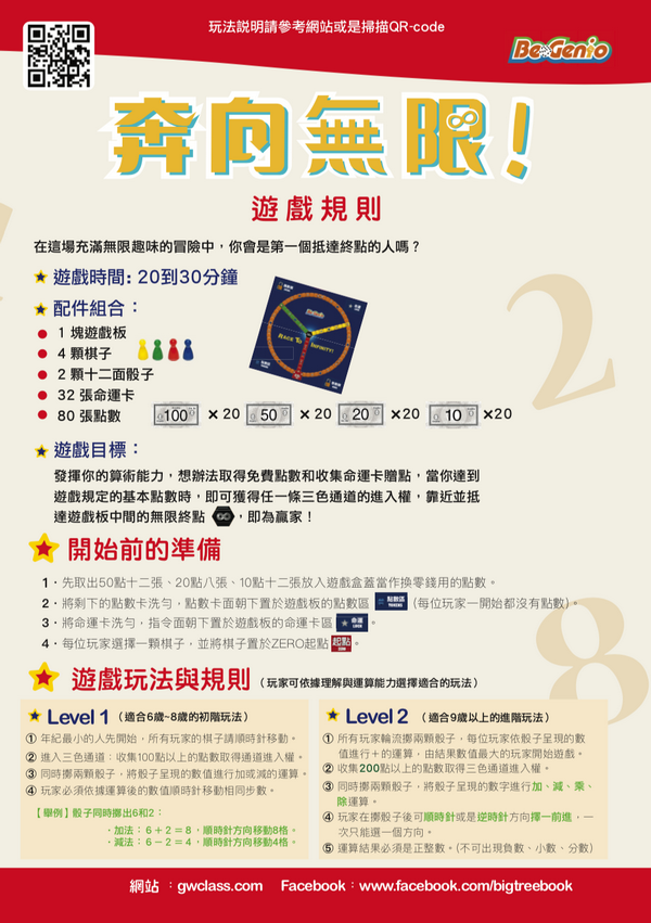 《奔向無限》是英國BeGenio遊戲公司為降低孩子對數學產生焦慮而研發的趣味桌遊。以開放、多樣的遊戲方式提升孩子對數學運算的樂趣。提供家長與老師以更有效的資源輔助孩子的學習。孩子時時刻刻都能享受數學、喜愛數學,從中建立對數學的自信。讓孩子放下那些寫不完的紙筆題庫吧!小小的腦袋需要快樂遊戲建構無限創意!