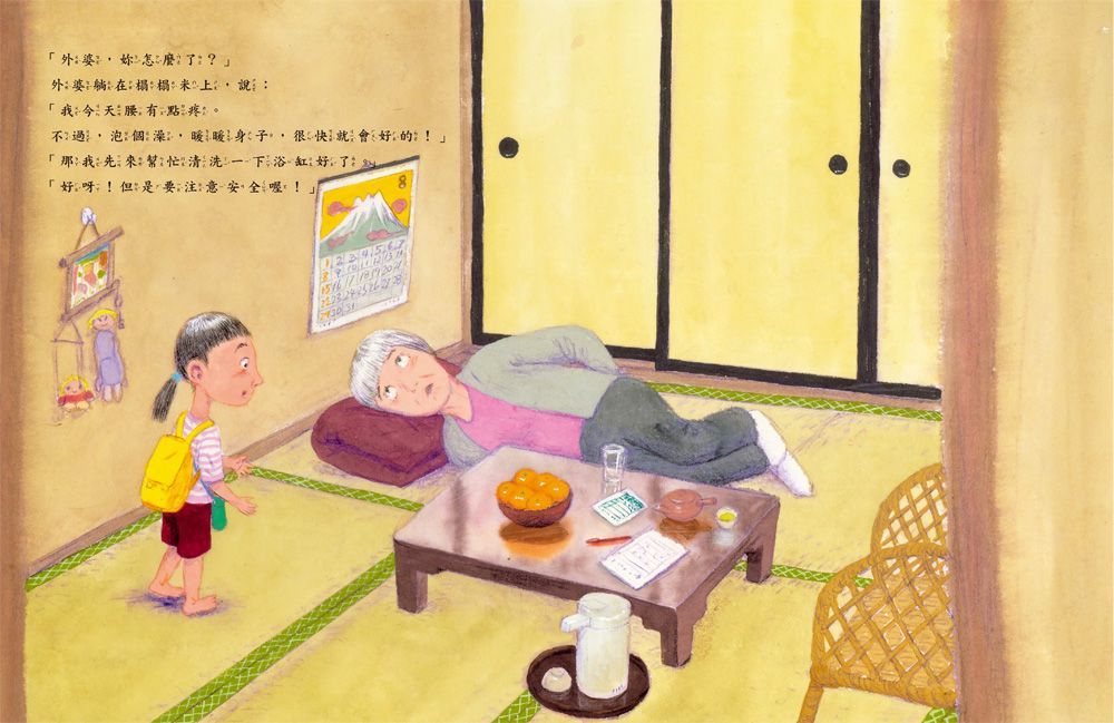 到外婆家過夜的小希美,發現外婆躺在榻榻米上,原來是腰痛發作了。外婆說,只要泡個澡,暖暖身子,身體很快就會好起來。「那我先來幫忙清洗一下浴缸好了」希美自告奮勇地說。