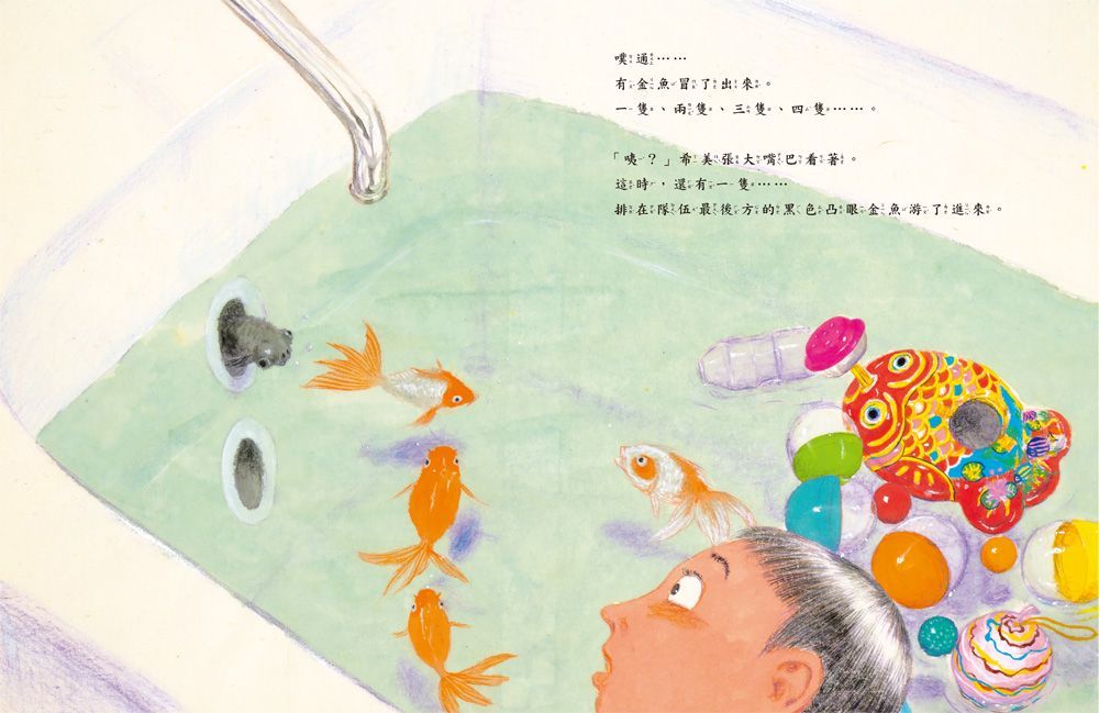 ★「金魚幫忙打掃浴室的這個奇妙故事真是太有趣了!為了讓金魚們在水流光後能繼續呼吸,它們像太空人一樣戴上充滿水的扭蛋外殼,還有很多讓人忍不住微笑的場景。這本書充滿夢幻,真是一本美妙的繪本。」──媽媽ピンピン,有3歲女兒