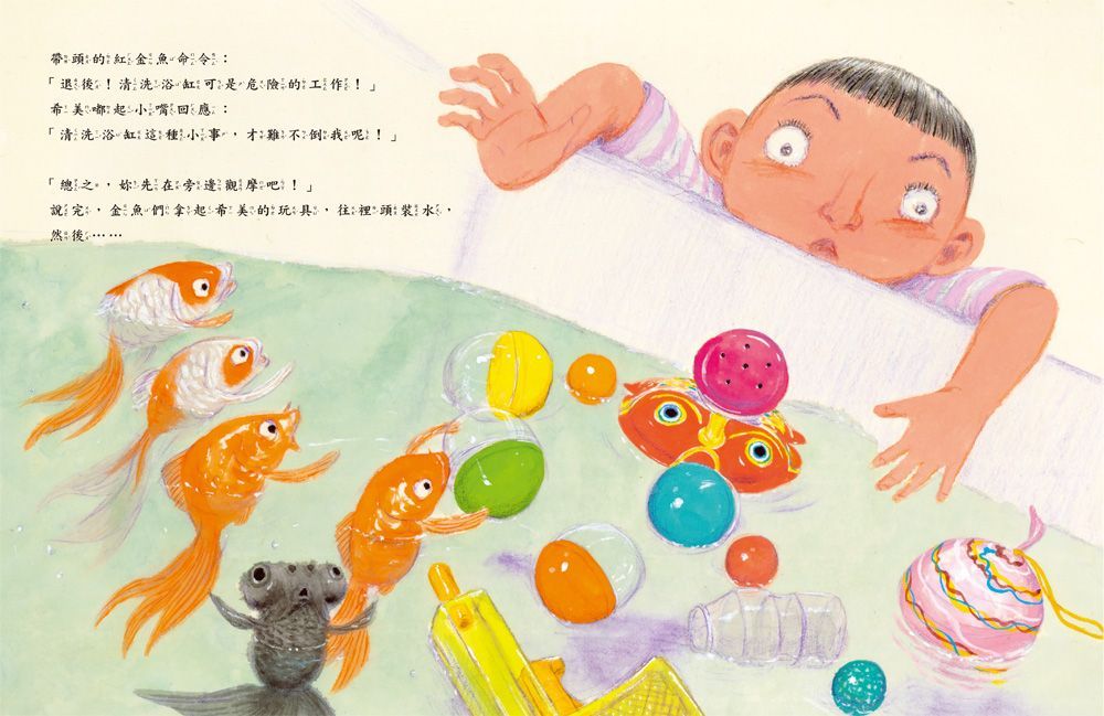 金魚們用扭蛋殼、養樂多罐裝滿水,帶在頭上當頭盔,開始清掃浴室。牠們先拔掉水塞排水,然後開始噴灑清潔劑,噗咻── 因為看起來太好玩了,小希美也忍不住模仿起來……