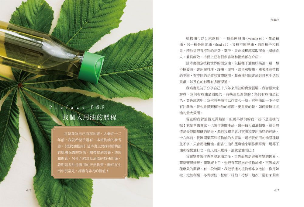 1.【植物油用於芳香療法】一開始入門芳香療法,新手會苦惱要買什麼植物油來稀釋精油?常常是甜杏仁油或荷荷芭油兩瓶打天下。其實,植物油內含的脂肪酸、碳鏈、多酚能讓肌膚維持健康與活力,不只是一種稀釋精油的介質,本身就能保護皮膚和身體。對新手來說,了解植物油的功效,不但能減少精油的劑量,還會增加配方的療癒效果!透過本書,你將學會挑選適合的油脂來製作DIY芳療產品,以及製作的方法──護膚膏、身體乳、身體磨砂膏、油膏、香草浸泡油、身體按摩油、臉部卸妝油、臉部保養油。