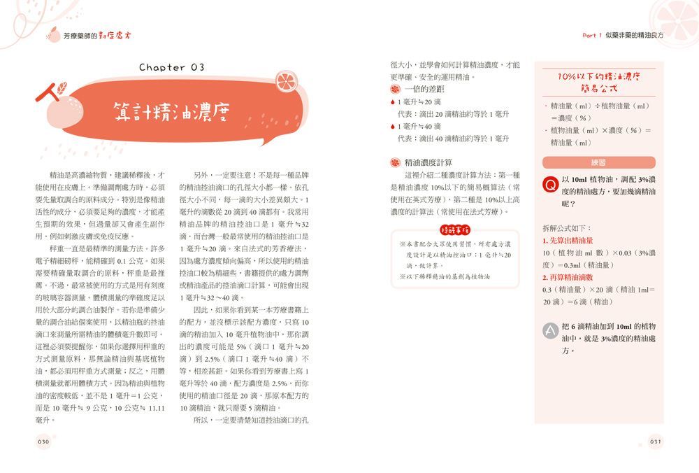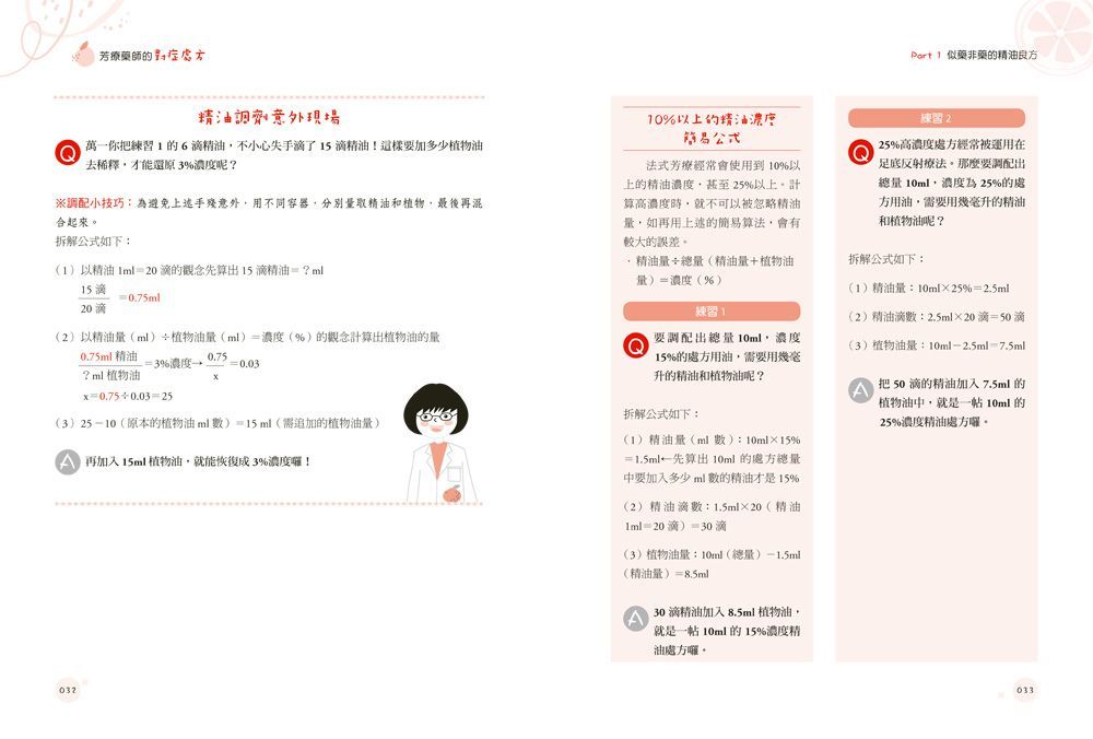 本書〈PART2芳療藥師的精油處方〉解決十二大類日常病症,分成西藥與成人芳療處方,分別解析藥物成分和精油處方的調配原理。讓你能夠正確用藥,短暫舒緩不適。並提供溫和不刺激、可長期保養的芳香療法配方。