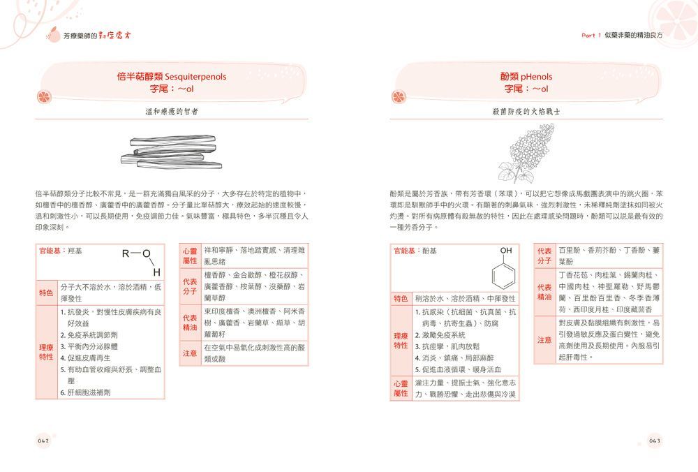 本書在每一帖精油處方中不斷地重複每一味精油的化學屬性(官能基),藉由官能基與療癒特性之間的連結,去理解精油的藥理作用,相信多看幾遍也就能朗朗上口,刻入腦海裡。