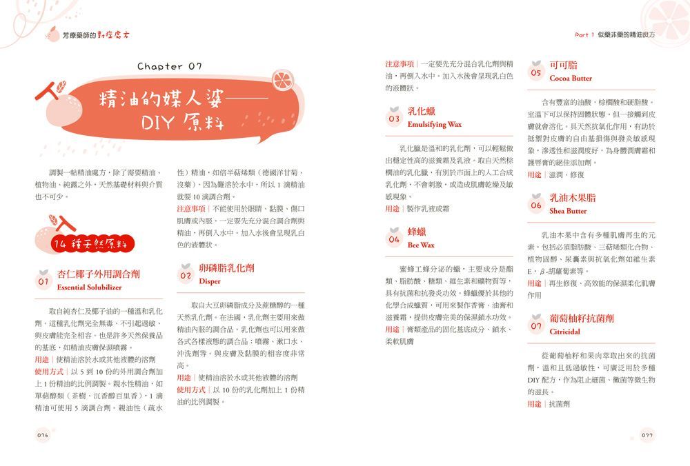 雖然大部分人覺得「精油化學好難」,但是擁有藥學與芳療背景的作者卻把精油化學當作藥物和精油的一座橋梁。她解析市售熱賣藥品的成分與藥理作用,對應精油化學分子的特性,創造出獨特的調配方法。並清楚告訴讀者如何正確使用藥膏或藥物來舒緩症狀。只要正確使用,藥物與精油都能成為恢復健康的好幫手!