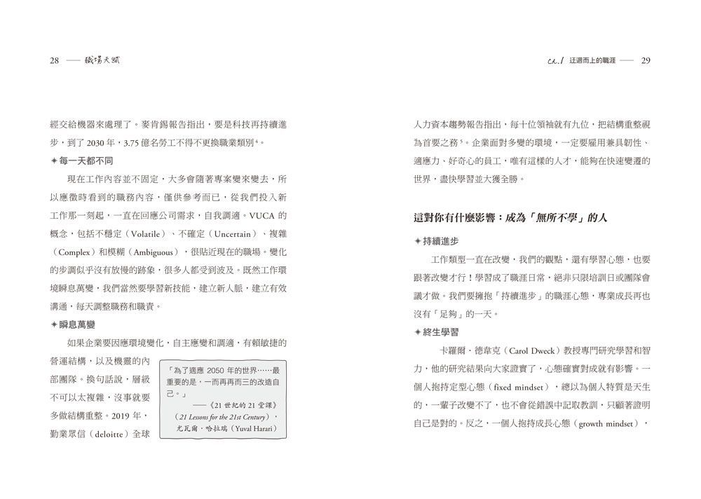 現在工作內容並不固定,大多會隨著專案變來變去,所以應徵時看到的職務內容,僅供參考而已,從我們投入新工作那一刻起,一直在回應公司需求,自我調適。VUCA的概念,包括不穩定(Volatile)、不確定(Uncertain)、複雜(Complex)和模糊(Ambiguous),很貼近現在的職場。變化的步調似乎沒有放慢的跡象,很多人都受到波及。既然工作環境瞬息萬變,我們當然要學習新技能,建立新人脈,建立有效溝通,每天調整職務和職責。