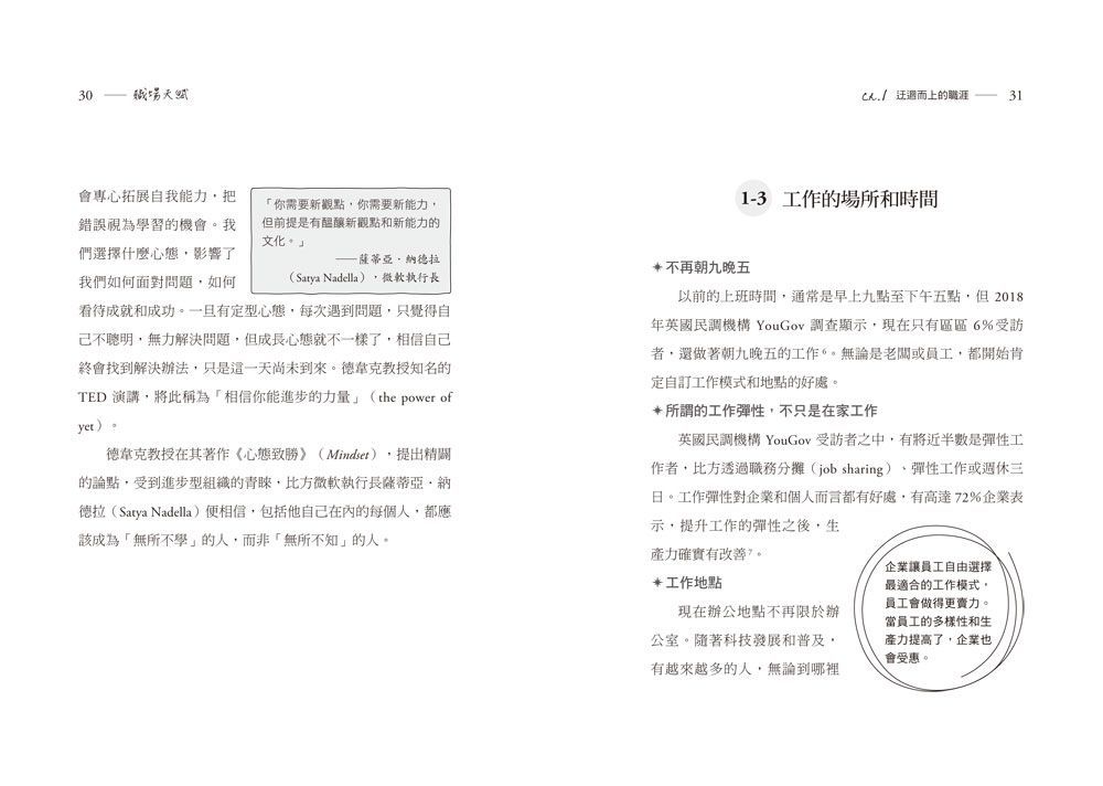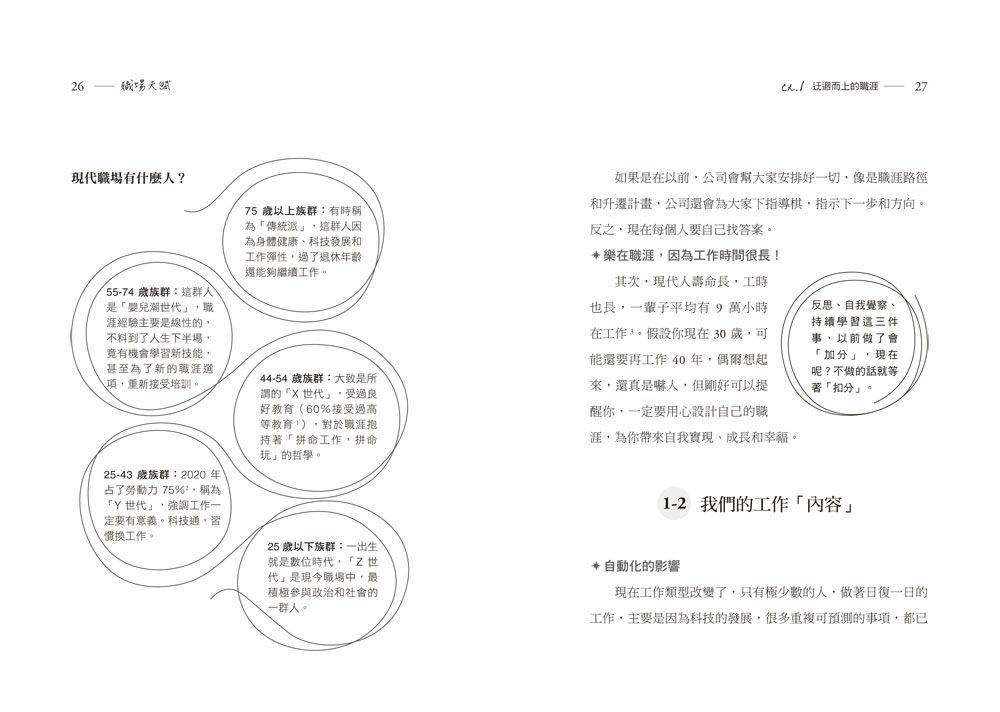其次,現代人壽命長,工時也長,一輩子平均有9萬小時在工作。假設你現在30歲,可能還要再工作40年,偶爾想起來,還真是嚇人,但剛好可以提醒你,一定要用心設計自己的職涯,為你帶來自我實現、成長和幸福。