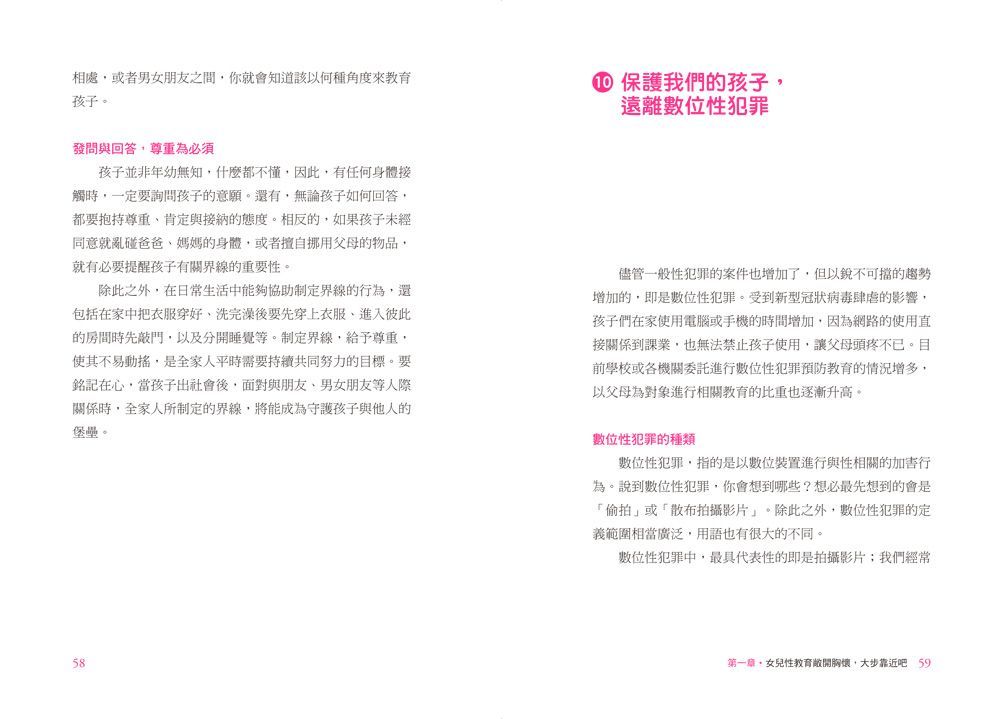 ‧性教育應該是循序漸進的,根據年齡和發展一點一點學習,讓妳長大成人後,可以按照自己的標準獨立行事。我最喜歡的是這本書沒有性別歧視,提醒女兒的訊息,不是以別人的眼光來看,而是教女兒「因為妳是自己身體的主人,所以必須愛惜自己的身體」,這句話讓我很感動,我認為這是我們的孩子生活在這世界必須保持的心態。