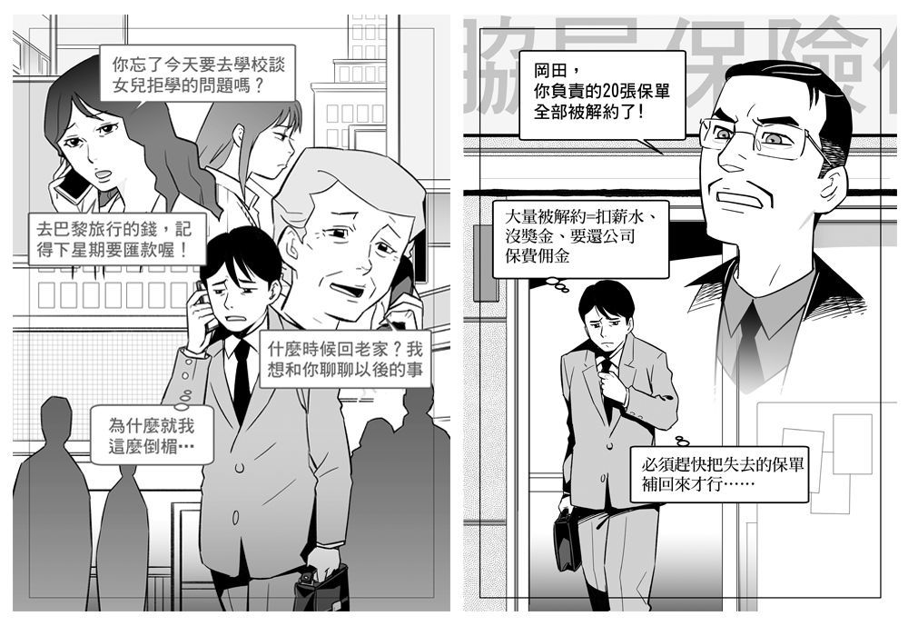 雖然為了逃離脇屋的斥責離開了辦公室,但一開始就知道沒戲唱了。修一也很清楚,當客戶解約後,即使厚著臉皮上門拜託,客戶也不可能說:「原來是這樣,那我還是向你買保險」這種話。