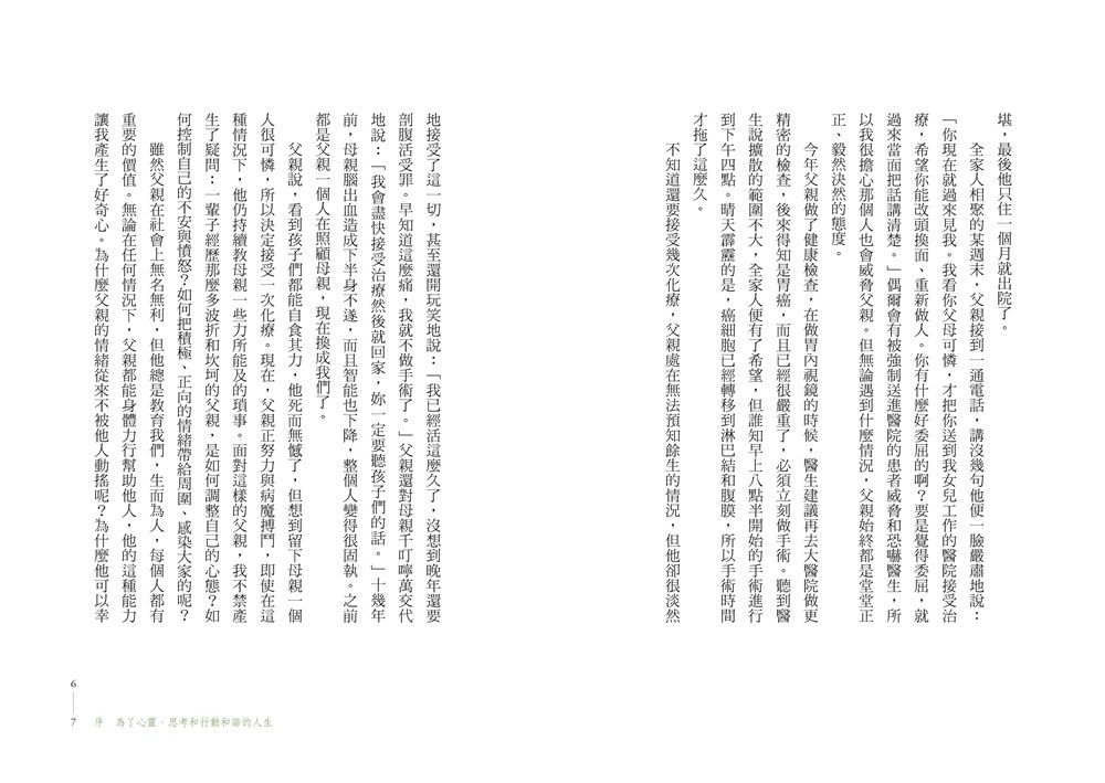 雖然父親在社會上無名無利,但他總是教育我們,生而為人,每個人都有重要的價值。無論在任何情況下,父親都能身體力行幫助他人,他的這種能力讓我產生了好奇心。為什麼父親的情緒從來不被他人動搖呢?為什麼他可以幸福地做每一件事呢?為什麼他那麼喜歡照顧周圍的人呢?為什麼他可以如此坦然地面對死亡呢?在寫這本書的過程中,我一直在思考這些問題。