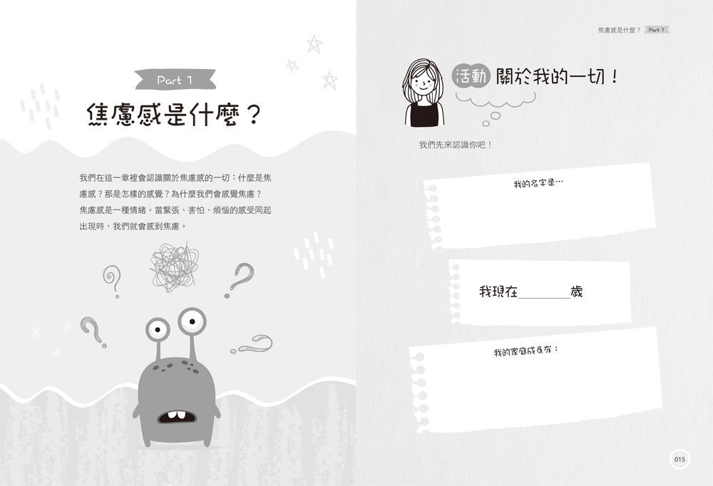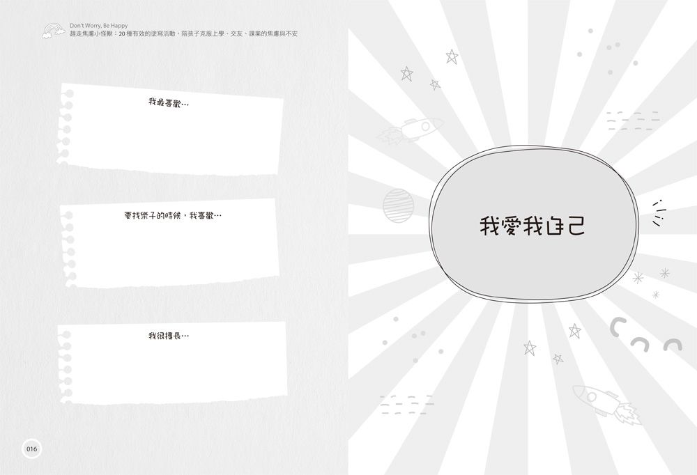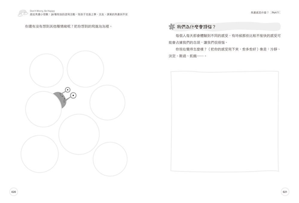 ‧「很棒的書!幫助我9歲的孩子緩解焦慮。很多頁面提供他寫下來和畫出來,很喜歡它!」