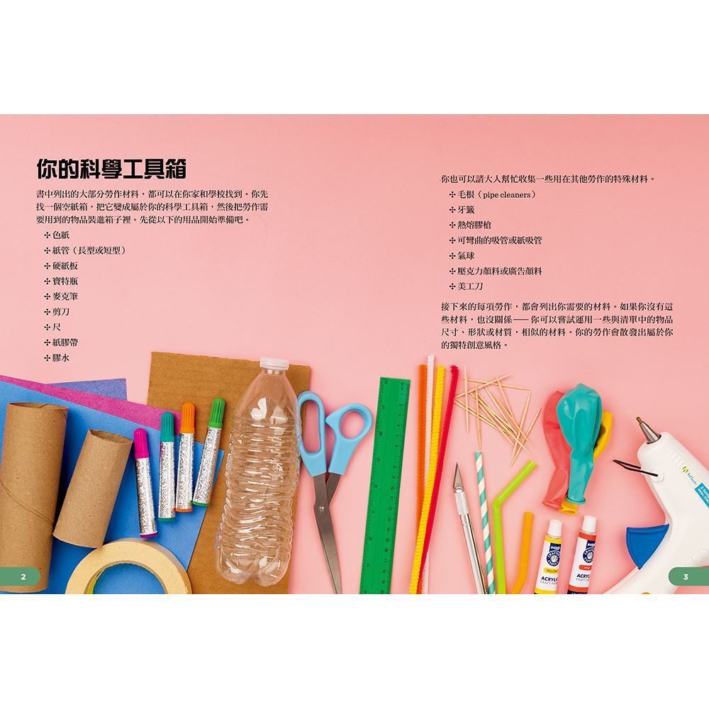 書中列出的大部分勞作材料,都可以在你家和學校找到。你先找一個空紙箱,把它變成屬於你的科學工具箱,然後把勞作需要用到的物品裝進箱子裡。先從以下的用品開始準備吧。