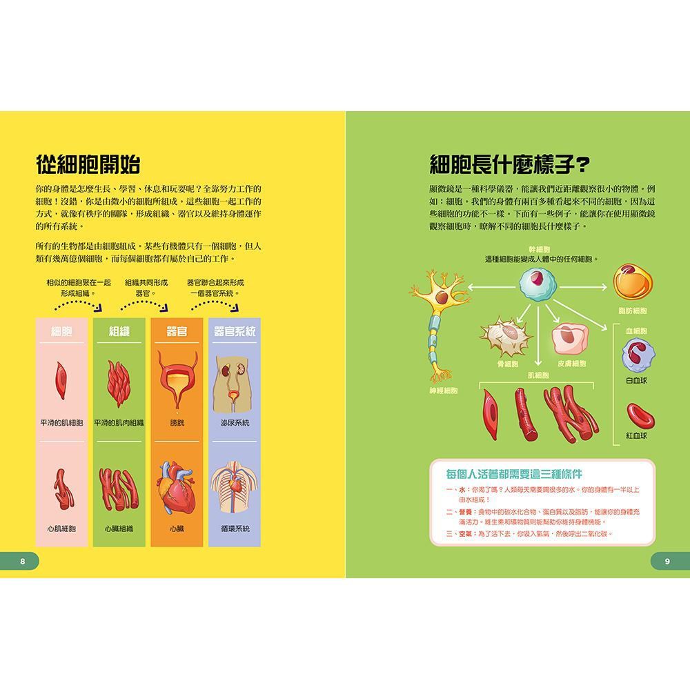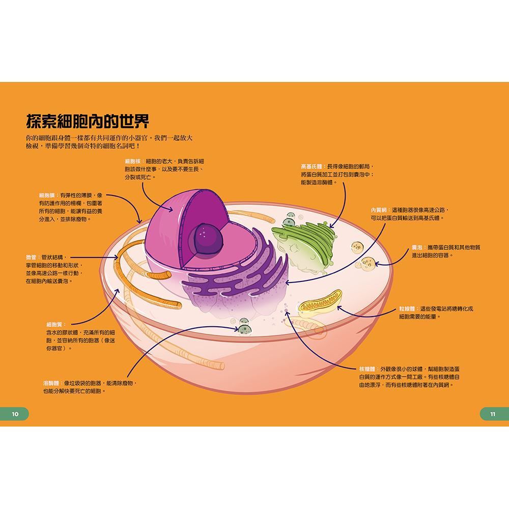 你的身體是怎麼生長、學習、休息和玩耍呢?全靠努力工作的細胞!沒錯,你是由微小的細胞所組成。這些細胞一起工作的方式,就像有秩序的團隊,形成組織、器官以及維持身體運作的所有系統。所有的生物都是由細胞組成。某些有機體只有一個細胞,但人類有幾萬億個細胞,而每個細胞都有屬於自己的工作。
