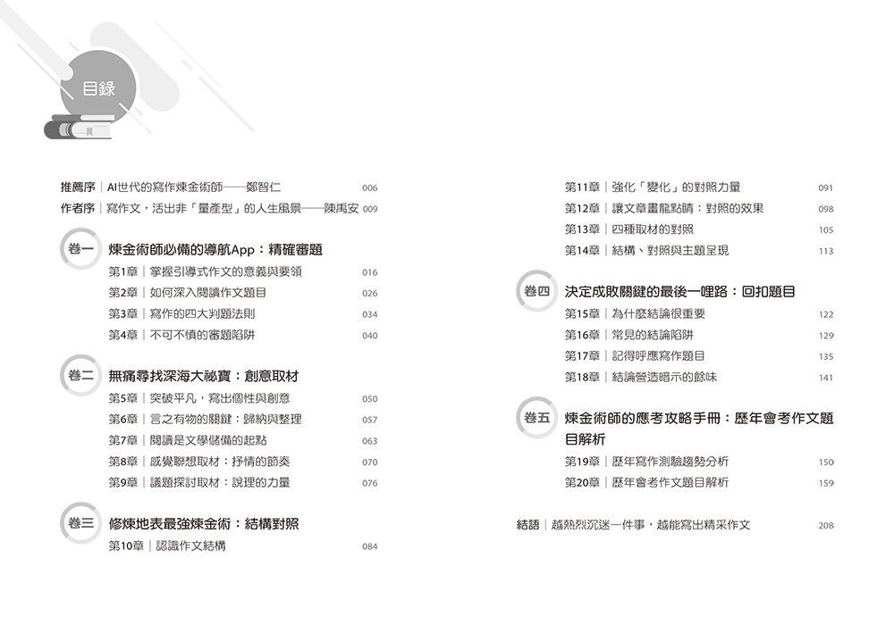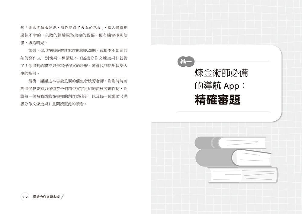 - 掌握作文的意義與要領,教你如何運用寫作的「四大判題法則」,精準佈局、規劃大綱,避免在下筆的第一步就誤入審題陷阱。