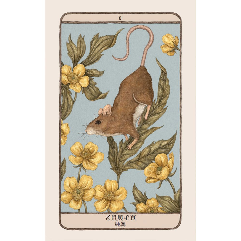 就像塔羅牌組中的「愚者」,「老鼠與毛茛」的牌號也是 0。這兩張牌都象徵著旅程的開端,並提醒我們還有很多需要學習的事情。老鼠很踏實且天真。不過,曾經在家裡應對老鼠的人都知道,牠們既果斷又有很強的適應力。我將老鼠和普通的毛茛配對,象徵著童年時期的純真。你曾經將毛茛放在下巴的下方嗎?根據古老的兒童遊戲,如果毛茛在你的皮膚上反射出黃色的光芒,則代表你喜歡奶油。