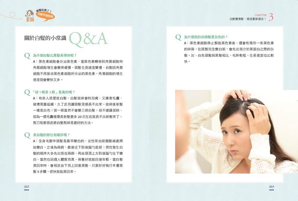 ★內文提及了穴位按摩、指壓的搭配,更教授讀者透過白髮位置的觀察,了解病因的判斷,完全把中醫對養髮的精髓融入生活。──中國醫藥大學藥學系副教授/黃世勳 博士‧藥師
