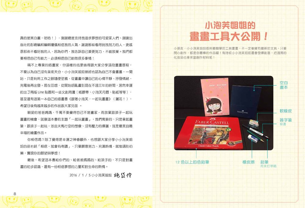 藉由這本插畫書,小泡芙姐姐希望讓小朋友可以一邊畫圖,一邊認識身邊的世界,並在畫畫中找到相信夢想的力量和對生命的熱情!結尾附錄有「一起玩遊戲」單元,不僅能讓爸媽陪著小朋友一起學習畫畫,也能一起畫出好玩的互動遊戲喲!