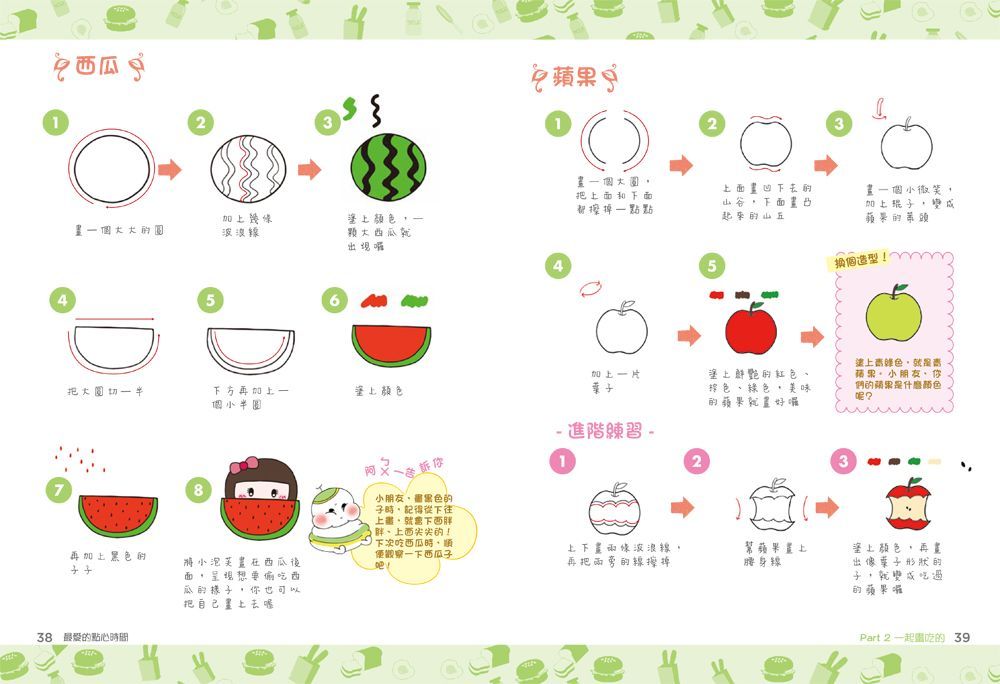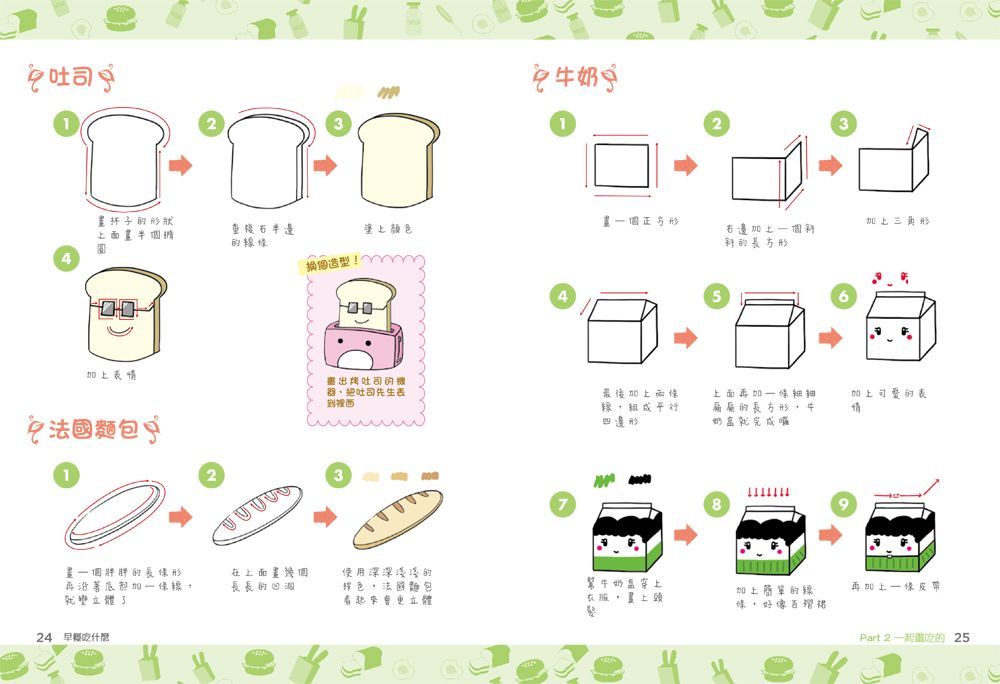 Part2「一起畫吃的」分為「早餐吃什麼」、「最愛的點心時間」與「蔬果最營養」三部份,教小朋友畫出自己最愛吃的食物、點心和水果!裡面有吐司先生、小豬棒棒糖、QQ珍奶,還有西瓜、草莓、鳳梨等各樣畫法呦!