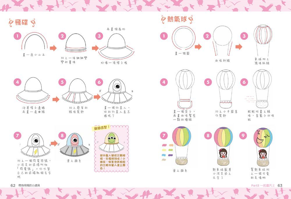 Part4「一起畫地上」則有「我家寵物真可愛」,教小朋友畫小鴨、小狗、兔子等萌寶貝,「美麗公園好好玩」中,可學到較難畫的蹺蹺板、溜滑梯、盪鞦韆等,在「動物王國變變變」中,則和大家一起畫猴子、企鵝及長頸鹿等可愛動物。