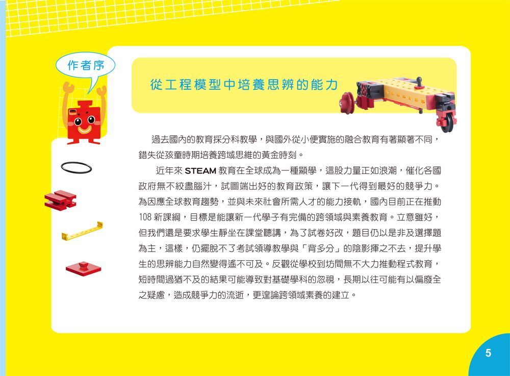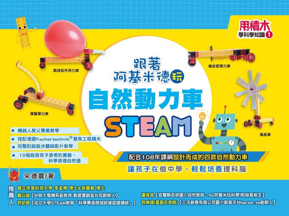 本書由機器人教父宋德震老師撰寫,其帶領競賽團隊在國際上斬獲無數兒童機器人獎項,將教育部最新的課綱融入內容,設計四款自然動力車,充分發揮STEAM精神。STEAM是近年來全球最受歡迎的跨學科教育,由科學(Science)、技術(Technology)、工程(Engineering)、藝術(Arts)及數學(Mathematics) 的第一個字母組成,培養孩子們理科腦的思考方式,讓孩子成為無法取代的跨領域人才。