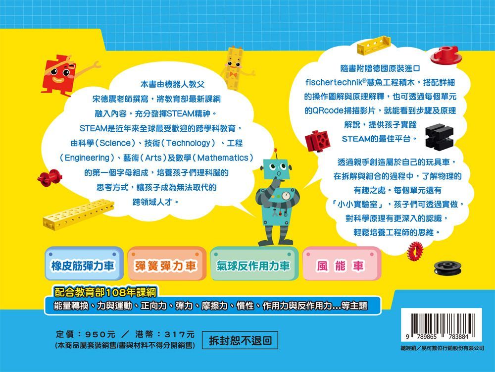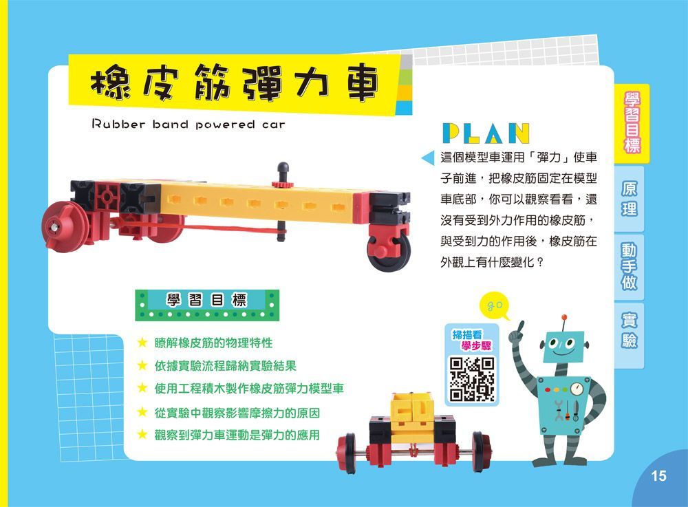 教學積木採用德國第一品牌的fischertechnik®慧魚工程積木,搭配詳細的操作圖解與原理解釋,也可透過每個單元的QRcode掃描連結影片,詳細的步驟及原理解說,提供孩子實踐STEAM的最佳平台。透過親手創造屬於自己的玩具車,在拆解與組合的過程中,了解物理的有趣之處。每個單元還有「小小實驗室」,孩子們可透過實做,對原理有更深入的認識,更能培養出工程師的思維。