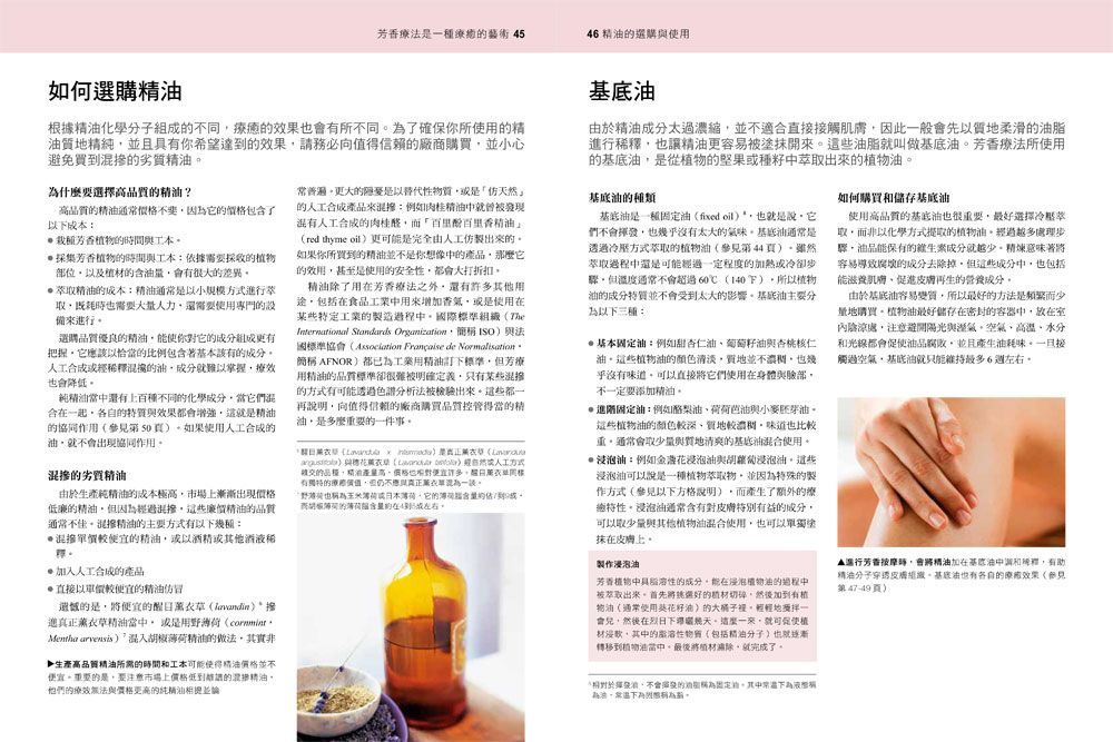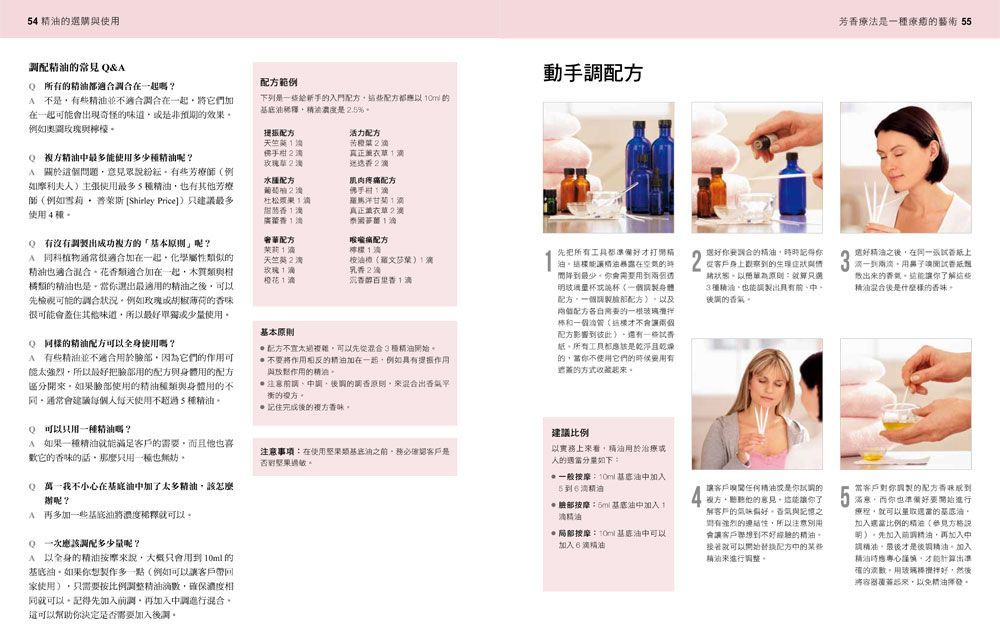 對芳香療法的各個相關領域都補充精要的基本概念。從芳香療法起源、精油化學類屬常識、如何挑選及調配精油、精油帶來的生理和心理作用、全身按摩手法、人體生理系統解析、特殊族群的芳香療法,甚至是如何成為成功的芳療師(進入職場、自立工作室、廣告與宣傳方式)等,對於想要扎實地打下芳療基礎,以及學會如何調配、選擇精油的人,本書是最好的選擇。●本書針對病症除了提供配方,更著重說明成因與思考點:坊間常見芳療工具書只以提供配方的方式滿足實用需求,本書的一大好處是它會描述症狀、解釋症狀發生的可能原因,以及芳療能在哪個部分起到作用。例如孕婦晨吐的症狀與懷孕過程中荷爾蒙導致消化系統變化有關,可以使用抗痙攣的苦橙葉安撫胃部平滑肌,加上刺激食慾的葡萄柚、消脹氣除胃酸的檸檬、止吐的薑等精油來協助。