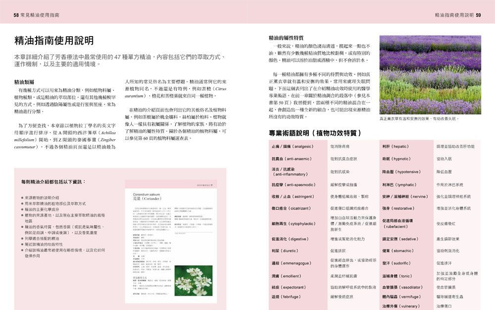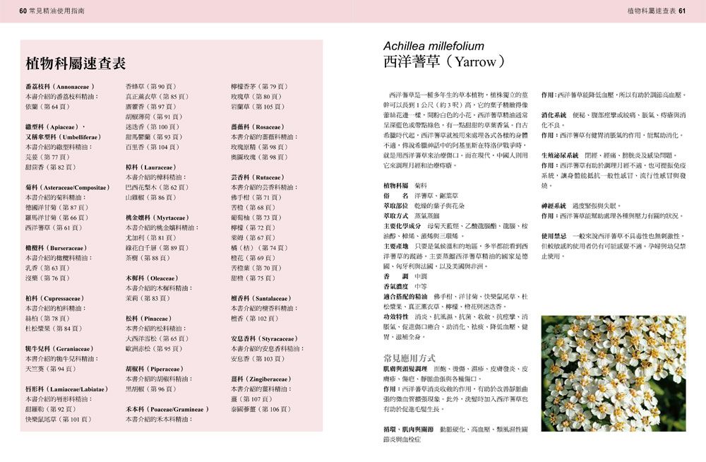 ●有大量的圖片與表格輔助說明:包括精油理論與生理系統介紹,很難得有非常清楚又漂亮的圖片。比起純文字的說明會更容易吸收知識。同時也適時提供比較表格,這些都有助於具體地、系統性地消化芳療知識。對於想要學得更深更廣的芳療學員來說,會是能夠引起興趣又具學習效率的優良參考書。