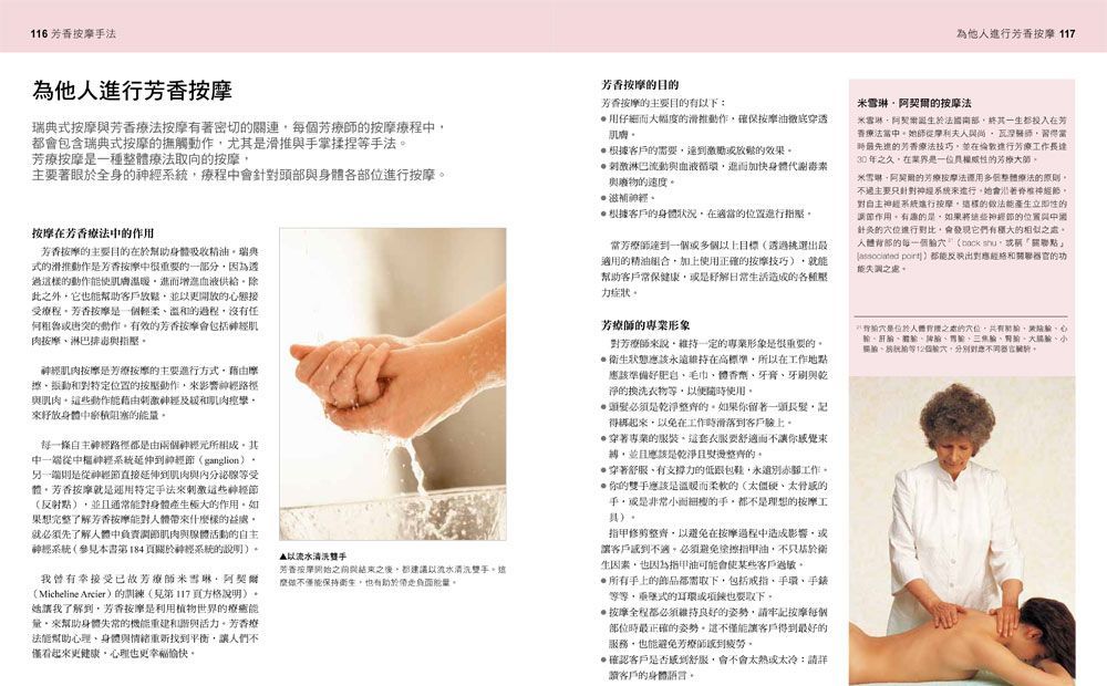●最正規的淋巴排毒按摩手法與完整步驟傳授為他人進行芳香按摩的關鍵注意事項,提供瑞典式按摩、全身按摩的基本手勢和坐式按摩的技巧。分成一般成年人、嬰幼兒。以及針對老人和癌症病患的芳香療法。