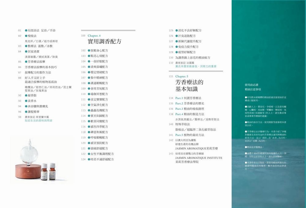 本書中特別收錄了56款原創精油配方、專為26種身心、生活情境所設計,適合總覺得自己調的精油就是「少一味」的老手,或想知道自己調出的和大師調的有何不同的人作為專業參考。從這些配方中甚至可能還會發現「原來玫瑰不適合配茶樹?」、「原來有個性的檸檬香茅也可以調得那麼平易近人」等等大師級的解惑方向。