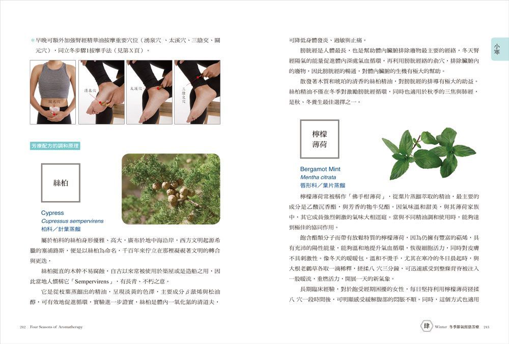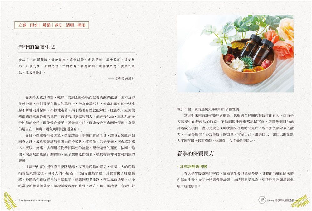「精油是從植物中萃取出的芳香物質,而精油帶來的,卻不只是芳香、更有紓壓、療癒、美容等效用,本書透過不同節氣、順應身體狀態、讓讀者學習搭配合適的精油與按摩手法,隨同作者一起開啟健康美麗的生活氛圍。」──精油學術權威、弘光科技大學學術副校長 易光輝