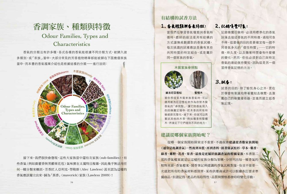 教你認識11種香氣家族,學習45種精油的香氣特性,分辨相似香氣的細微差異。