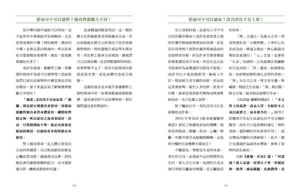 3.學會辨別疾病證型:不是用體質分類調油就好,學會辨別體質之後,還需辨別疾病證型。作者在第六章用「十大呼吸道疾病」的個案解析,讓你了解疾病從頭到尾可能的變化,在前中後階段,精油配方需要微調的中醫原理。